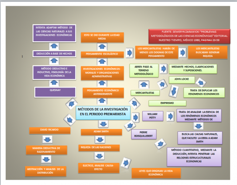 “La economía política es una ciencia relativamente joven. Sus métodos de investigación las tomó al principio de las ciencias que se desarrollaron más temprano” (Seweryn Zurawicki, año 1980, página 151), debido a esto, el estudio de la economía con la aplicación metodológica tardo, a pesar de se encontraba implícita en el pensamiento económico. Lo mercantilistas fungieron como los que rompieron con las limitaciones que enmendaba la iglesia, al romper con ciertos paradigmas relacionados con la usura. Y aplicarían, aunque indirectamente, un método empírico, pues se basaban mucho es su experiencia como comerciantes, con los hechos en su vida diaria dedicada al comercio. Para después dar paso a la escuela francesa fisiócrata, al mando de Quesnay. “Quienes pretendían adaptar los métodos comprobados con las ciencias naturales a las investigaciones económicas.” ” (Seweryn Zurawicki, año 1980, página 153) Aprovechando su profesión como médico y los métodos en las ciencias naturales, Quesnay adoptaría por el método analógico, entre el cuerpo humano comprada con el sistema económico. Más adelante sería Adam Smith quién plantearía un método más enfocado al contexto, así Smith se plantearía la premisa de “todos somos egoístas”, de aquí partiría para abordar más temas, con el hecho de que todos los individuos somos egoístas y al hacerlo otorgamos un bien a la sociedad, esto es lo que veía Adam desde un punto de vista burgués en cuanto a cómo se daban las relaciones, por lo que se le puede considerar que uso el método empírico, basado en sus observaciones, aunque ciertamente no profundizo mucho en sus temas. El continuador de su obra es David Ricardo, continúa con la premisa relacionado con el egoísmo, tomaría parte del método histórico aunque ciertamente muy poco, pero Ricardo se caracterizaría por usar la abstracción, sus pensamientos trascenderían más allá de la realidad llegando a la conclusión que “las relaciones económicas de de buscarse dentro del proceso de la producción “ (Seweryn Zurawicki, año 1980, página 156). Más adelante la búsqueda por las leyes económicas así como el de una metodología tuvo el riesgo de ser desviada, pero fue el Marxismo que la superaría. ![]() |